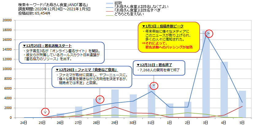 一方、シエンプレが運営するデジタル・クライシス総合研究所の調査によると、本件に関するTwitter投稿数(2020年12月24日~2021年1月5日)は、6万5,454件に上りました。