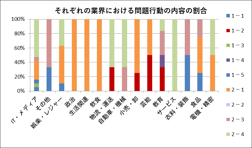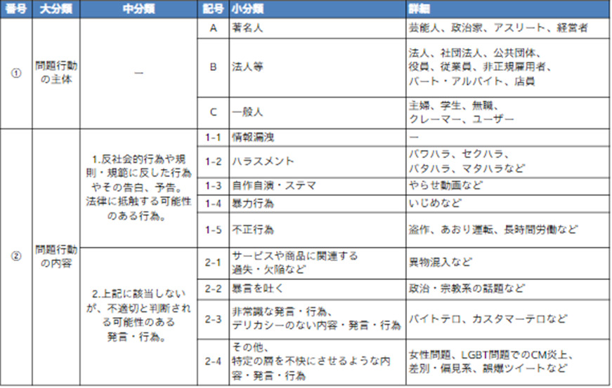 また、問題行動の主体が「法人等」の場合、表2に基づき19の業界に分類しました。なお、表2に該当しない業界に関してはその他としてデータを処理しました。