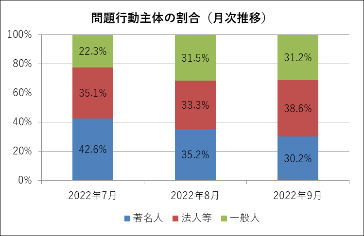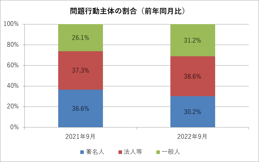 炎上事案の原因となった問題行動の主体別の内訳では、「著名人」57件(30.2 %)、「法人等」73件(38.6%)、「一般人」59件(31.2%)という結果でした。