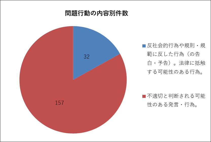 炎上の原因となった問題行動のうち、157件(83.1%)が「不適切と判断される可能性のある発言・行為。」に該当し、「反社会的行為や規則・規範に反した行為(の告白・予告)。法律に抵触する可能性のある行為。」は32件(16.9%)と少数でした。