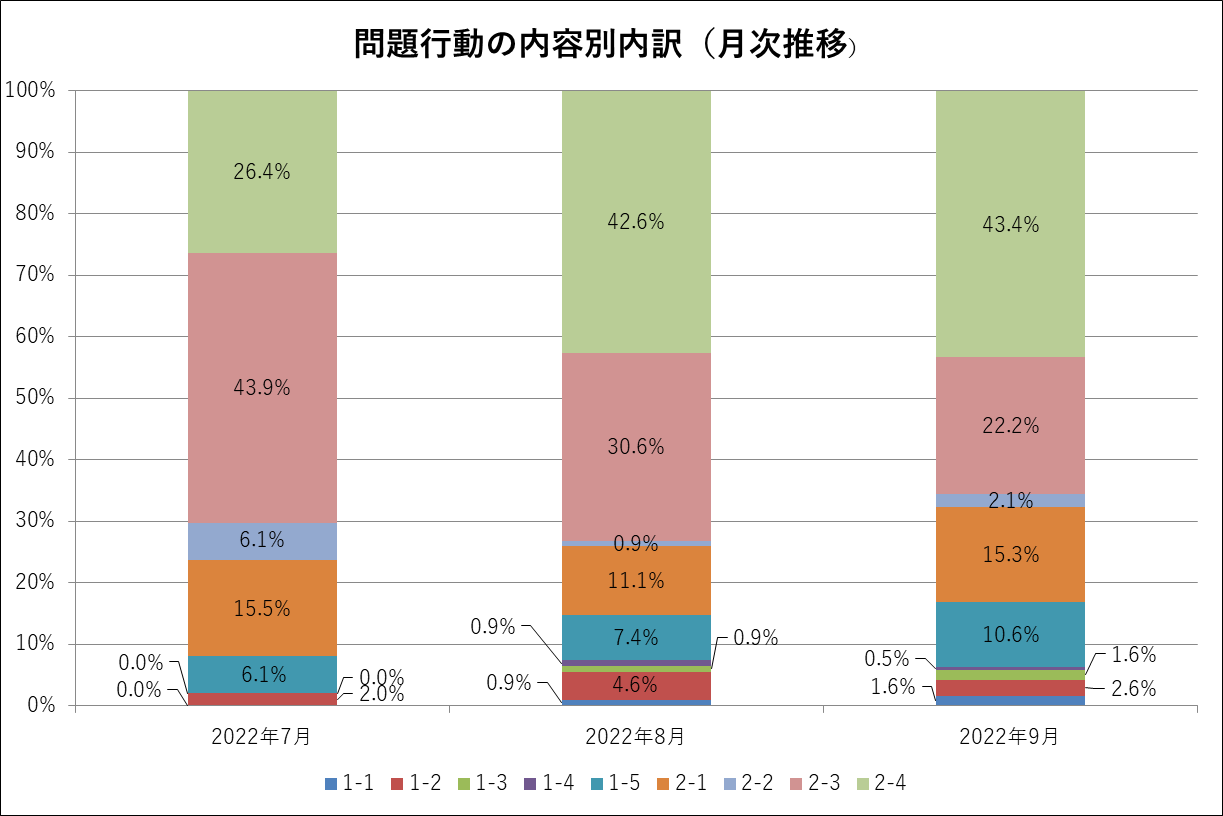 また、炎上の要因となる問題行動の内容をみると、分類2-4(その他、特定の層を不快にさせるような内容・発言・行為)に該当する事案が82件と、9月の炎上事案の43.4%を占めています。
