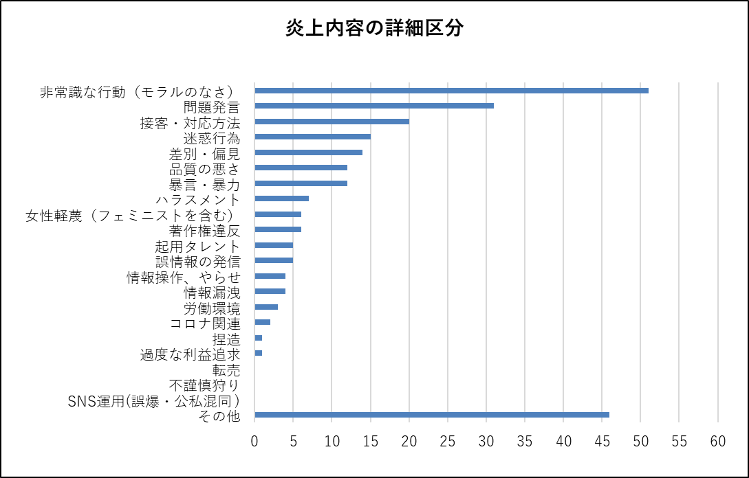 炎上内容の詳細を分析したところ、「非常識な行動(モラルのなさ)」に関する炎上事案が51件、「その他」を除いた場合、次いで「問題発言」に関する炎上事案が31件でした。
