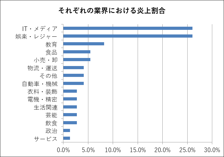 ・炎上事案が多かった業界は「IT・メディア」「娯楽・レジャー」業界でした。「娯楽・レジャー」業界は前月に比べ、16件増加しています。