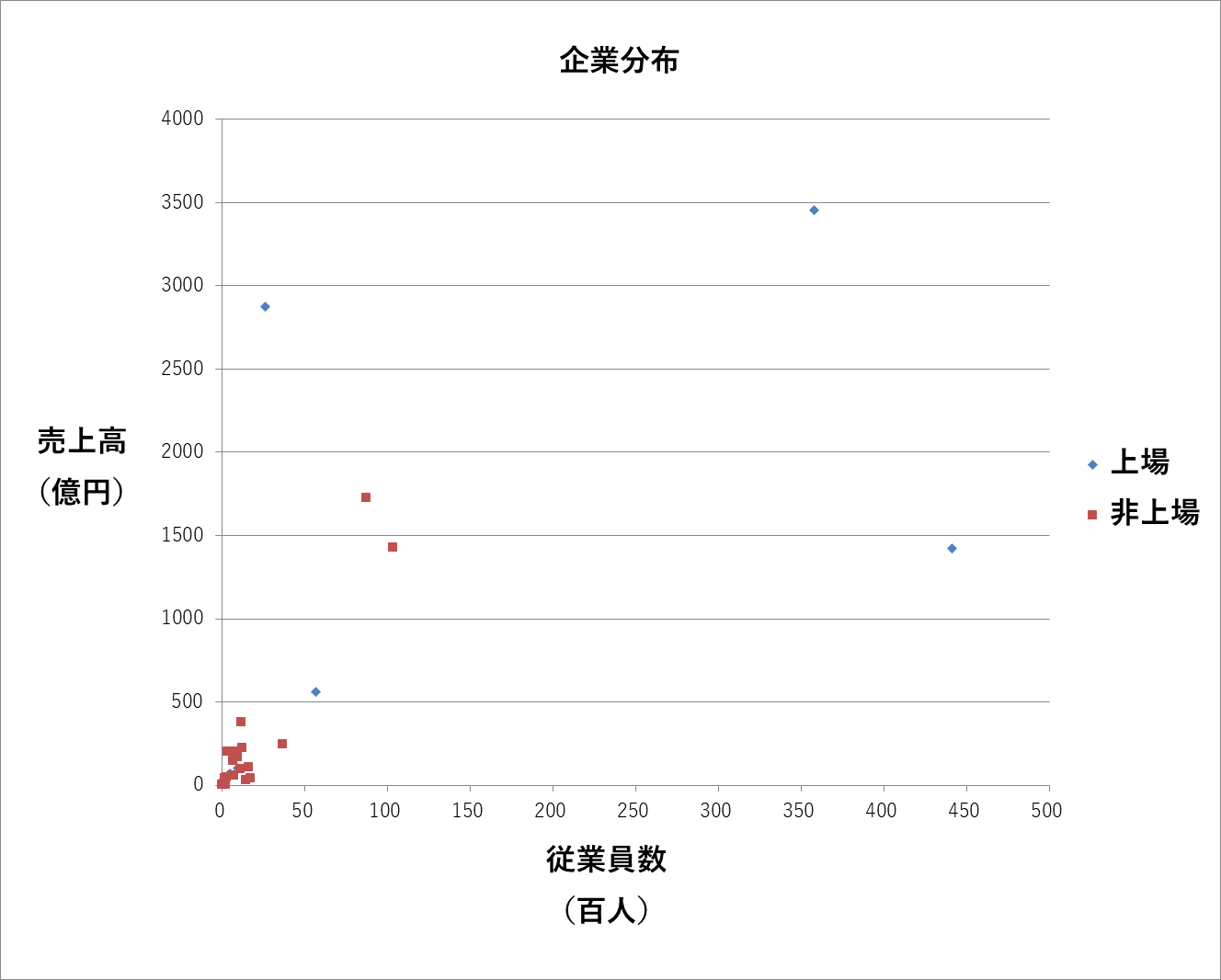 これらの日系企業が上場企業か否か、また、それぞれの従業員数について分析しました。