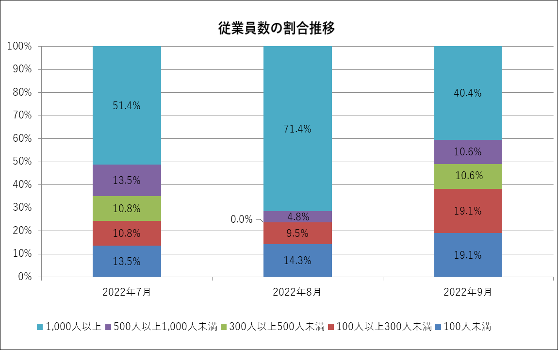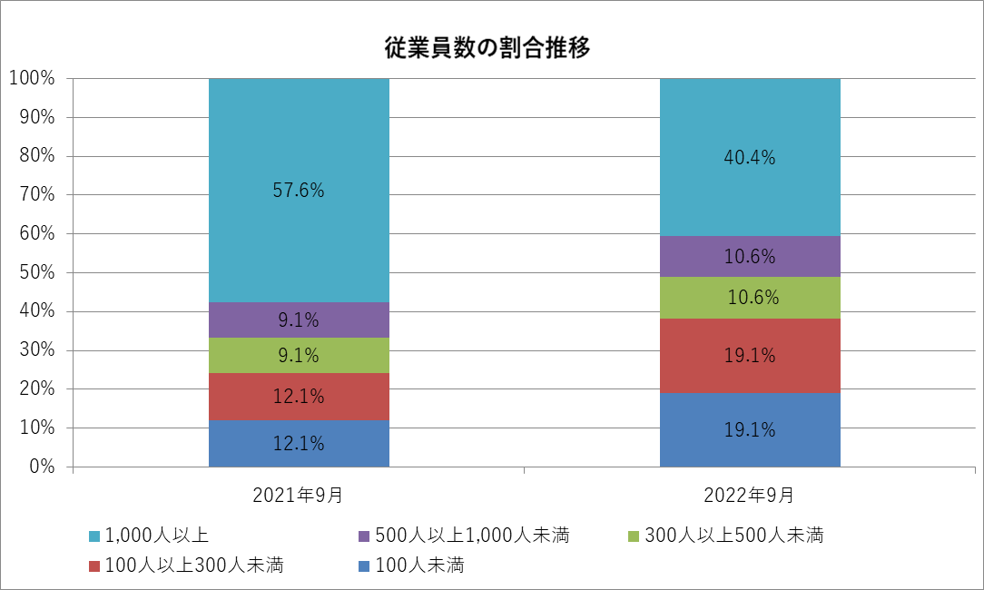 前年同月比では、1,000人以上の従業員数の企業の割合が17.2ポイント減少しています。