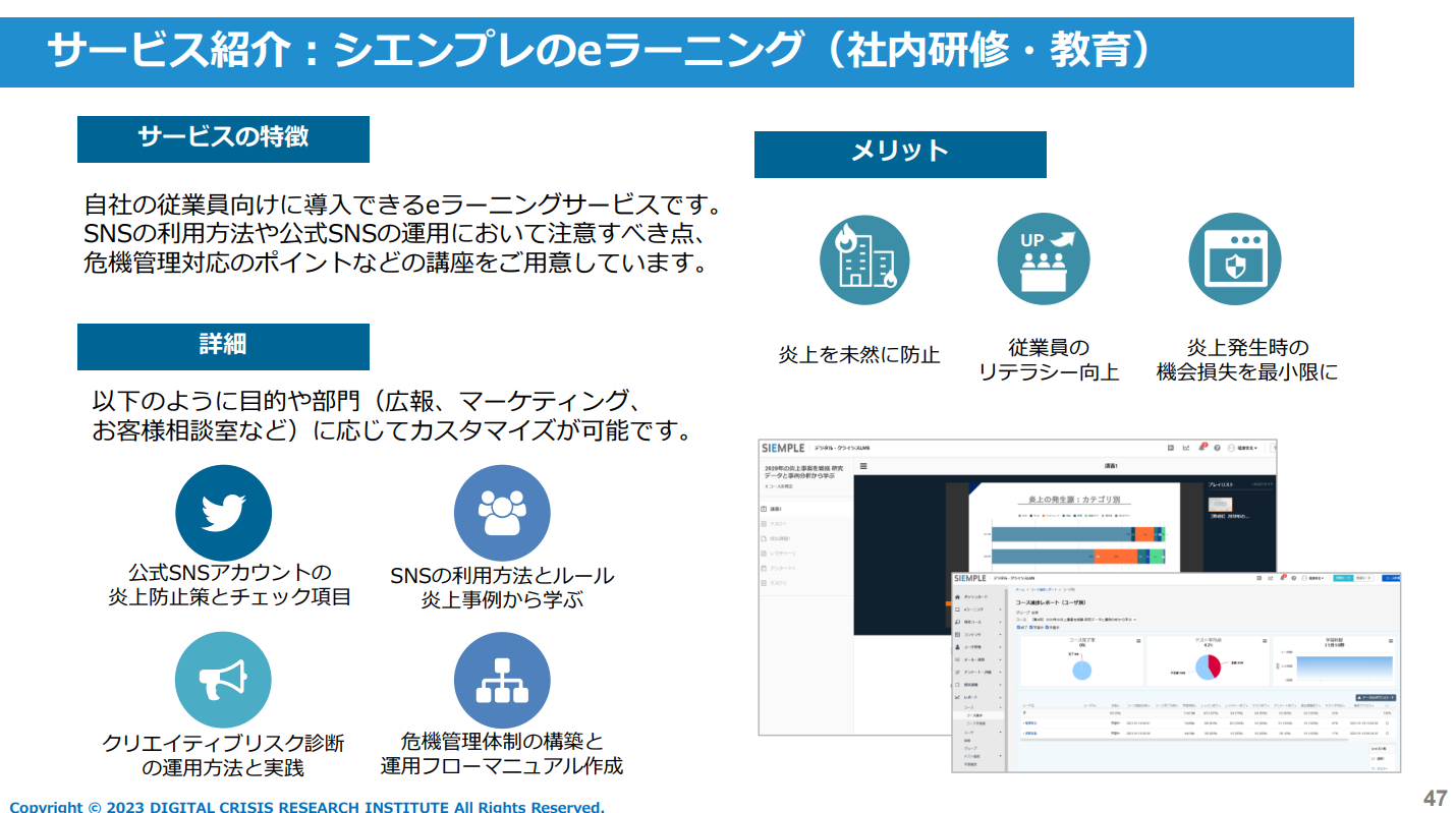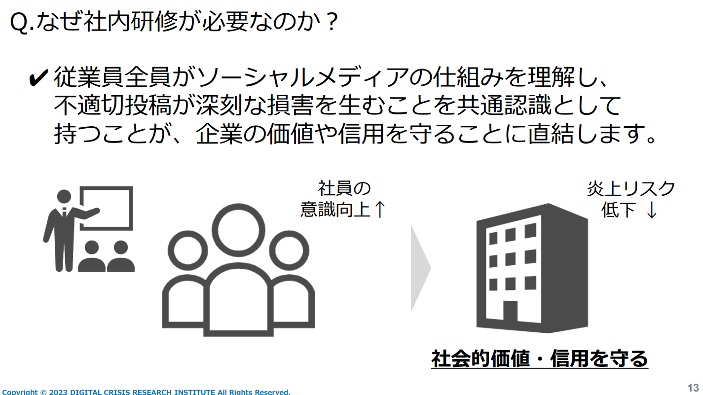 桑江:社内研修は、炎上リスクをいかに「自分事」と思わせられるかがポイントです。また、炎上事例のトレンドは刻一刻と移り変わっているので、どんなに優れた研修も一度実施すれば安心できるということにはなりません。