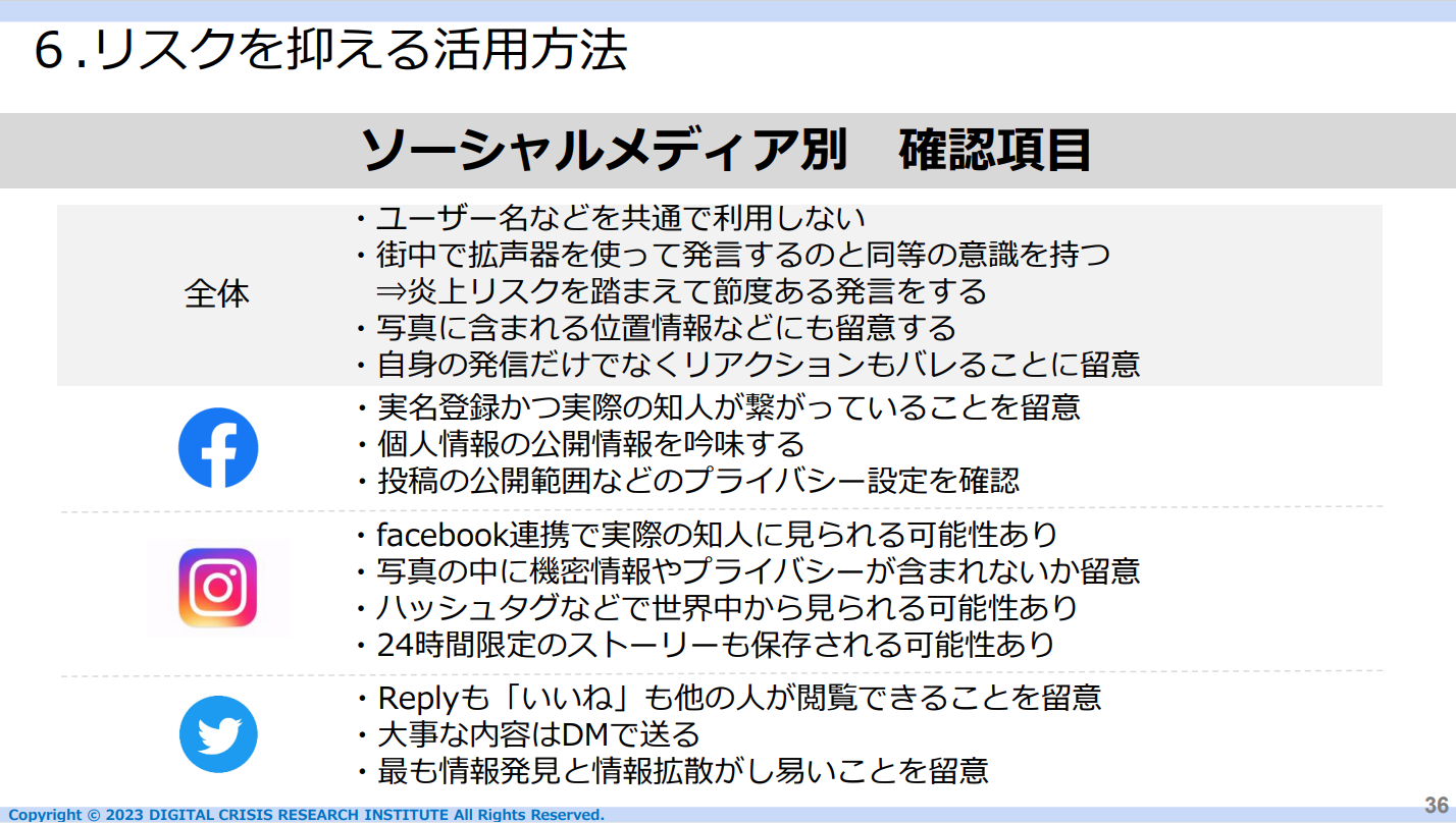 前薗:新入社員のSNS利用については、不適切投稿を抑止するための規定を設けた誓約書の提出やガイドラインの策定・運用などを通したリスクマネジメントの方法があります。しかし、プライベートな時間のソーシャルメディアの利用にどこまで介入できるのか頭を悩ませている企業も多いでしょう。