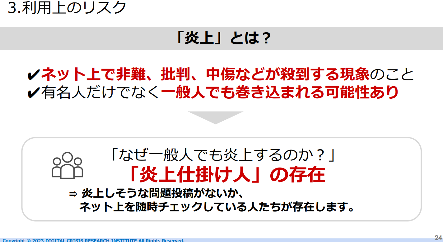 企業としては、拡声器で触れ回ったとしても問題のない内容かどうかを投稿前にしっかりチェックできるようにしなければなりません。