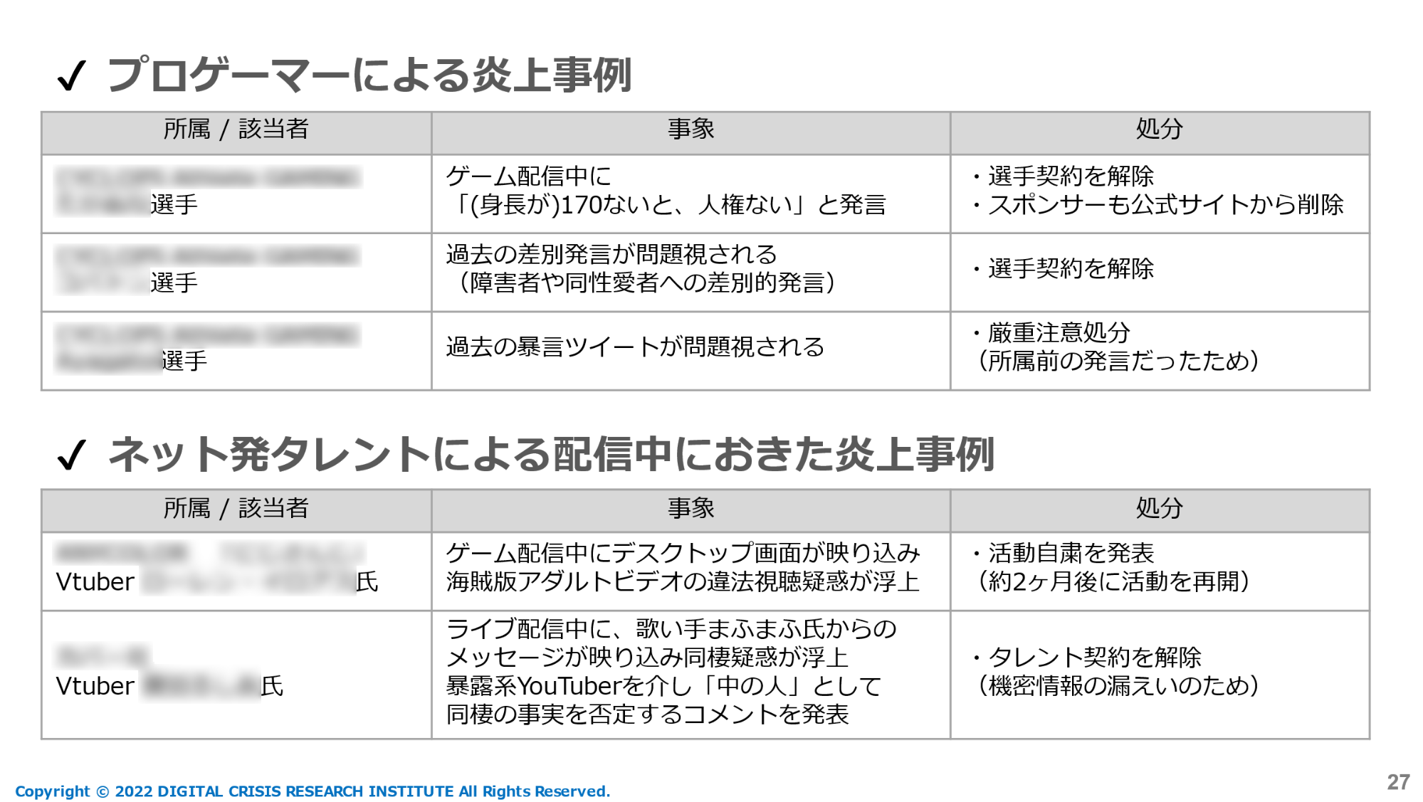 桑江:「差別関連」の失言が引き起こした炎上事例もありました。プロeスポーツチームで人気を誇るD選手がゲームの配信中に障がい者を差別するような発言をしたとして、所属チームが公式サイトなどで謝罪しました。