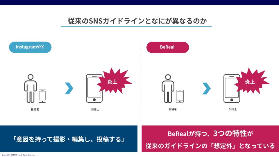 それは、従来のSNSガイドラインなどで想定しているバイトテロや、従業員による不適切なコンテンツの投稿と、BeRealの問題は異なるからです。