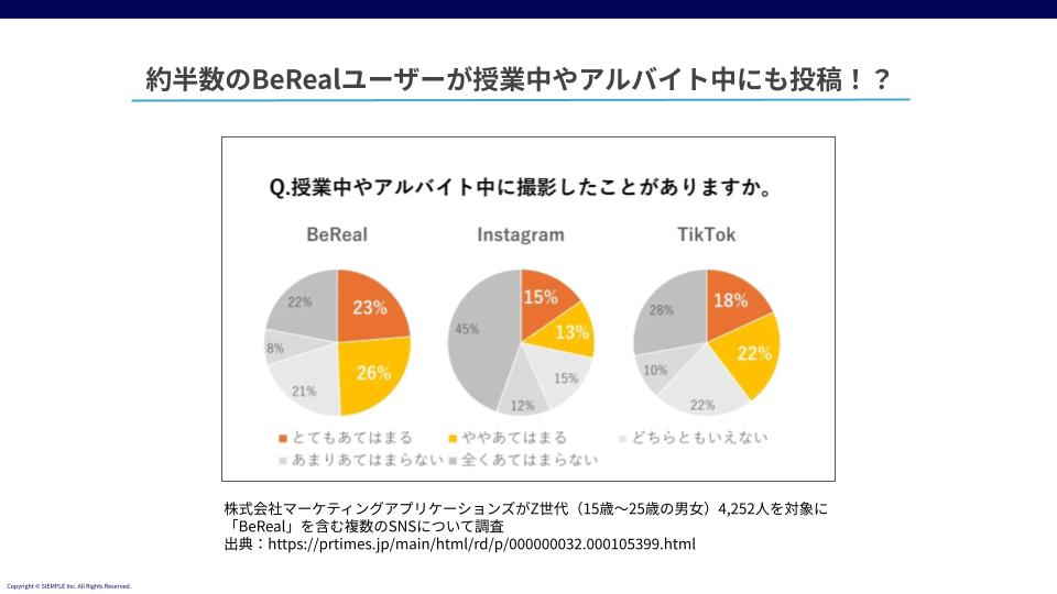 こうした中、リサーチ業界向けのプラットフォームサービス会社がBeRealユーザーである15〜25歳の男女4,252名に実施した調査では、約半数が授業中やアルバイト中にも投稿したことがあると回答しています。