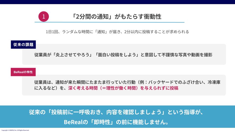 では、なぜ従来のSNSガイドラインや研修では、BeRealのバイトテロを防ぐことができないのでしょうか?
