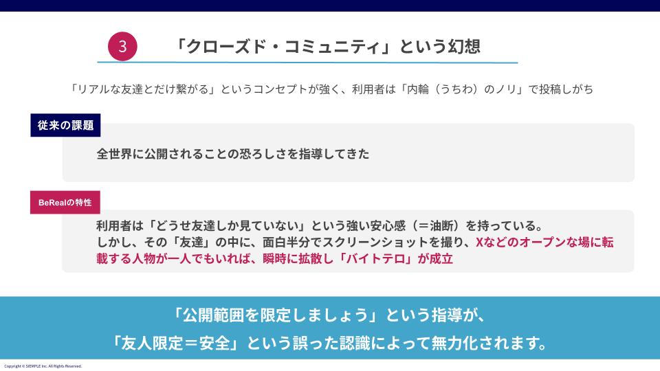 「公開範囲を限定しましょう」という従来の指導が、「友人限定=安全」という誤った認識によって無力化される中、BeRealの不適切な投稿をXなどのオープンな場に転載する人物が一人でもいれば、瞬時に拡散して「バイトテロ」が成立してしまいます。