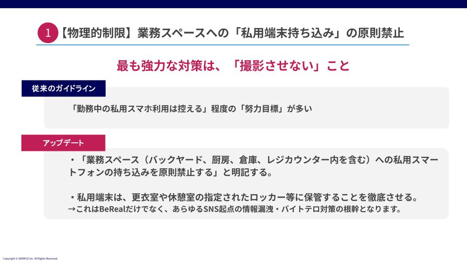 アップデート版では、「業務スペース(バックヤード、厨房、倉庫。レジカウンター内を含む)への私用スマートフォンの持ち込みを原則禁止する」などと明記し、私用端末は更衣室や休憩室の指定されたロッカーなどに保管することを徹底させることが求められます。場合によっては、学校の持ち物検査のようなチェックをする必要もあると思います。