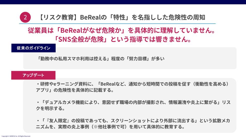 アップデートの際は、研修やeラーニング資料に「BeRealなど通知から短時間での投稿を促す(衝動性を高める)アプリ」の危険性を具体的に記載し、「デュアルカメラ機能により、意図せず職場の内部が撮影され、情報漏洩や炎上につながる」リスクを明示することが求められます。