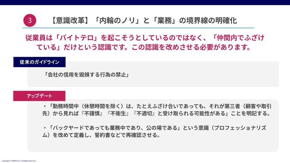 また、「バックヤードであっても業務中であり、公の場である」という意識(プロフェッショナリズム)を改めて定義し、誓約書などで再確認させることも重要です。