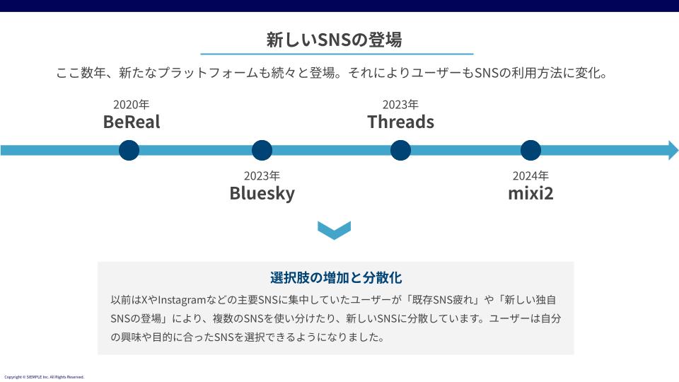 ユーザーは複数のSNSを使い分けたり新しいSNSに分散したりして、自分の興味・目的に合ったSNSを選択できるようになりました。