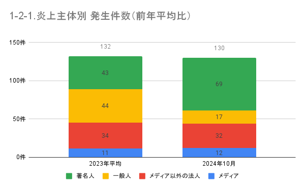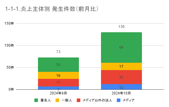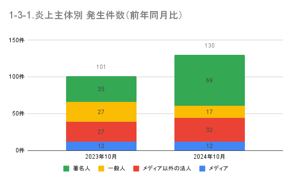 炎上主体別の内訳は、「著名人」が34件の増加、「一般人」が10件の減少、「メディア以外の法人」が5件の増加、「メディア」が変動なしという結果でした。