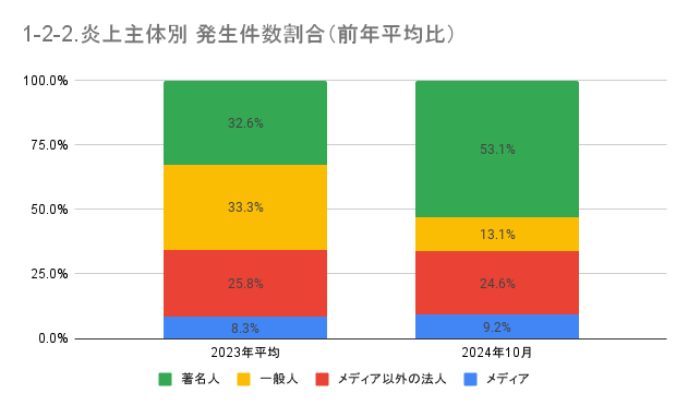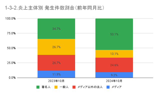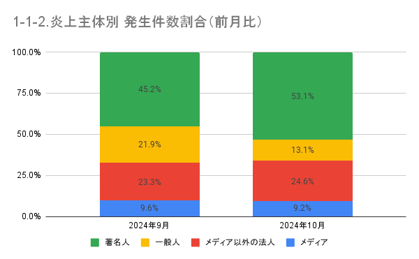 割合については下図のとおり、前年同月と比較し、「著名人」が18.4ポイントの増加、「一般人」が13.6ポイントの減少、「メディア以外の法人」が2.1ポイントの減少、「メディア」が2.7ポイントの減少という結果でした。