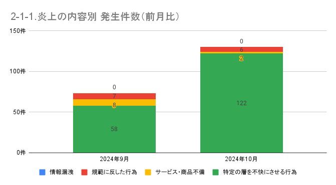 前月と比較すると、「情報漏洩」は変動なし、「規範に反した行為」は1件の減少、「サービス・商品不備」は6件の減少、「特定の層を不快にさせる行為」は64件の増加という結果でした。