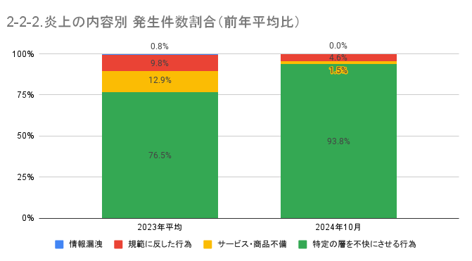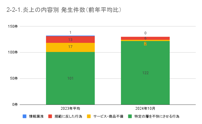前年平均の割合と比較すると、「情報漏洩」が0.8ポイントの減少、「規範に反した行為」が5.2ポイントの減少、「サービス・商品不備」 が11.4ポイントの減少、「特定の層を不快にさせる行為」が17.3ポイント増加しました。
