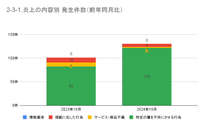 前年同月の件数と比較すると、「情報漏洩」が変動なし、「規範に反した行為」が4件減少、「サービス・商品不備」が7件減少、「特定の層を不快にさせる行為」が40件増加しました。