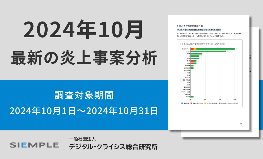 2024年1月31日、デジタル・クライシス総合研究所はソーシャルメディアを中心とした各種媒体とデジタル上のクライシスの特性、傾向と論調を把握するために「デジタル・クライシス白書2024」(調査対象期間:2023年1月1日~2023年12月31日)を公開しました。 継続調査の結果報告として、今回は2024年10月1日〜2024年10月31日の調査対象期間に発生した炎上事案について、新たに分析しています。