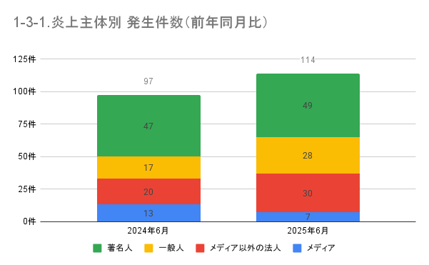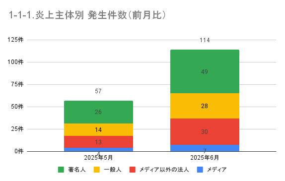 2025年6月の炎上件数は114件と、ここ3ヶ月50件台で推移していた炎上件数が倍増する結果になったようです。 昨年の2024年6月の97件に比べても増えており、特に著名人や一般人などの特定の分野の炎上が増えたわけでもなく全体的に倍増している点には注意が必要です。 ここしばらくは、昨年からの大手芸能事務所等による炎上インフルエンサーへの法的措置警告や誹謗中傷に対する警鐘が効果を出しているように見えましたが、その効果が薄れてきたか、SNS側のロジック変更でまた炎上が可視化されやすくなっている可能性があります。