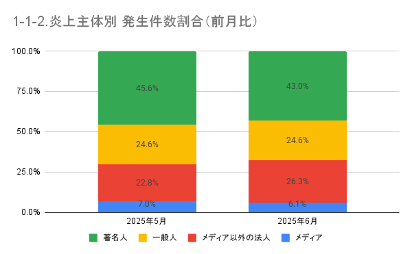 割合については下図のとおり、前月と比較し、「著名人」が2.6ポイントの減少、「一般人」が変動なし、「メディア以外の法人」が3.5ポイントの増加、「メディア」が0.9ポイントの減少という結果でした。
