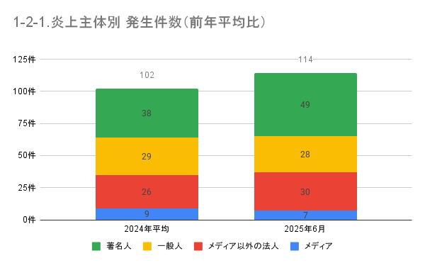 炎上主体別の内訳は、「著名人」が2件の増加、「一般人」が11件の増加、「メディア以外の法人」が10件の増加、「メディア」が6件の減少という結果でした。