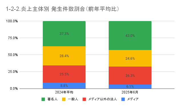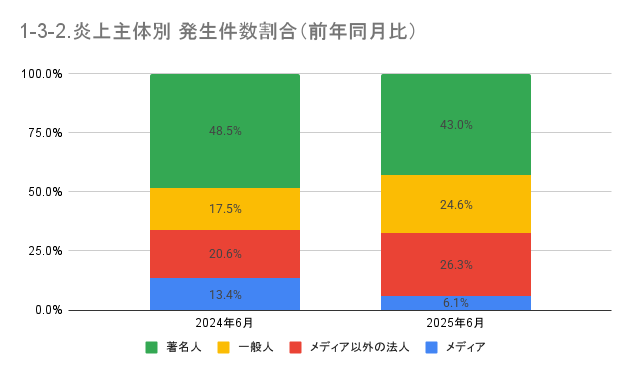 割合については下図のとおり、前年同月と比較し、「著名人」が5.5ポイントの減少、「一般人」が7.1ポイントの増加、「メディア以外の法人」が5.7ポイントの増加、「メディア」が7.3ポイントの減少という結果でした。