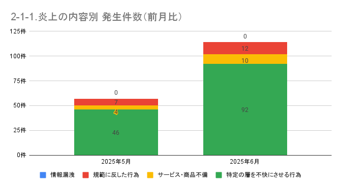 前月と比較すると、「情報漏洩」は変動なし、「規範に反した行為」は5件の増加、「サービス・商品不備」は6件の増加、「特定の層を不快にさせる行為」は46件の増加という結果でした。