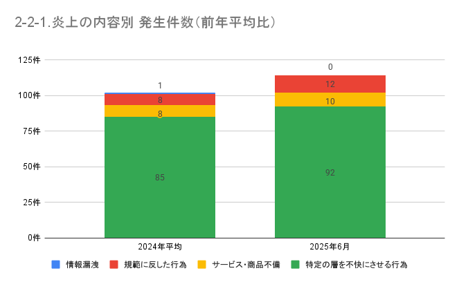 前年の平均発生件数と比較すると、「情報漏洩」が1件減少、 「規範に反した行為」が4件増加、「サービス・商品不備」が2件増加、「特定の層を不快にさせる行為」が7件増加しました。
