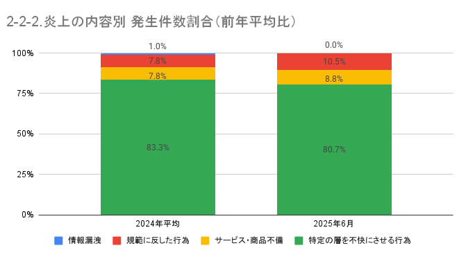 前年平均の割合と比較すると、「情報漏洩」が1.0ポイントの減少、「規範に反した行為」が2.7ポイントの増加、「サービス・商品不備」 が1.0ポイントの増加、「特定の層を不快にさせる行為」が2.6ポイント減少しました。