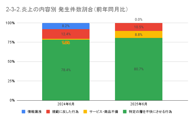 前年同月の割合と比較すると、「情報漏洩」が8.2ポイント減少、「規範に反した行為」が1.9ポイントの減少 、「サービス・商品不備」が7.8ポイントの増加、「特定の層を不快にさせる行為」が2.3ポイント増加しました。