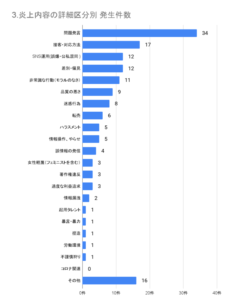 炎上内容の詳細を分析したところ、「問題発言」に関する炎上事案が34件と最も多く、次いで「接客・対応方法」に関する炎上事案が17件でした。