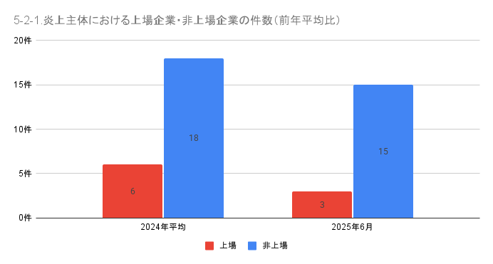 前年平均と比較すると、「上場企業」の件数は3件減少、「非上場企業」の件数は3件減少しました。