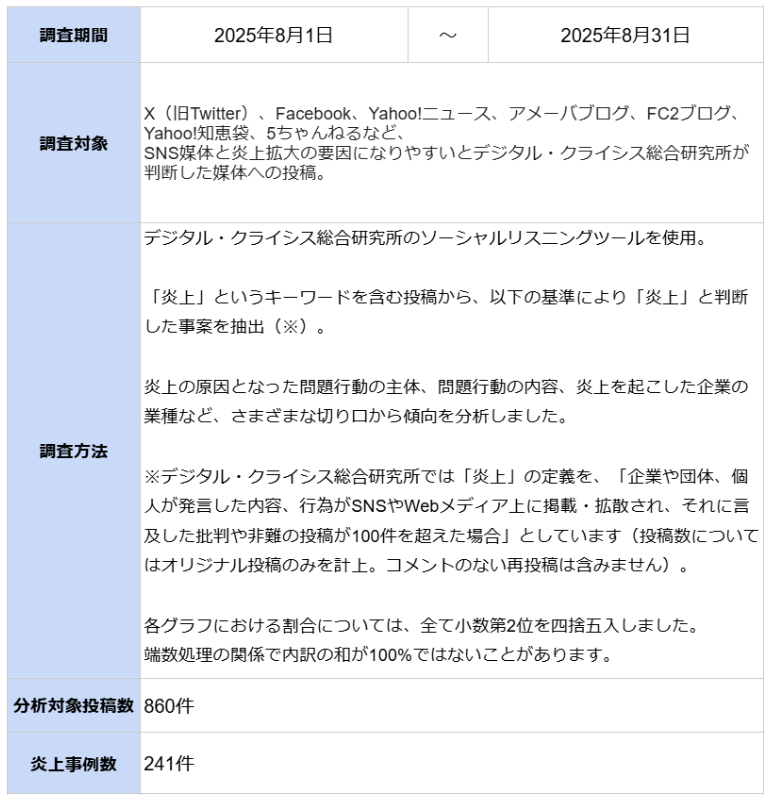 2025年1月28日、デジタル・クライシス総合研究所はソーシャルメディアを中心とした各種媒体とデジタル上のクライシスの特性、傾向と論調を把握するために「デジタル・クライシス白書2025」(調査対象期間:2024年1月1日~2024年12月31日)を公開しました。 継続調査の結果報告として、今回は2025年8月1日〜2025年8月31日の調査対象期間に発生した炎上事案について、新たに分析しています。