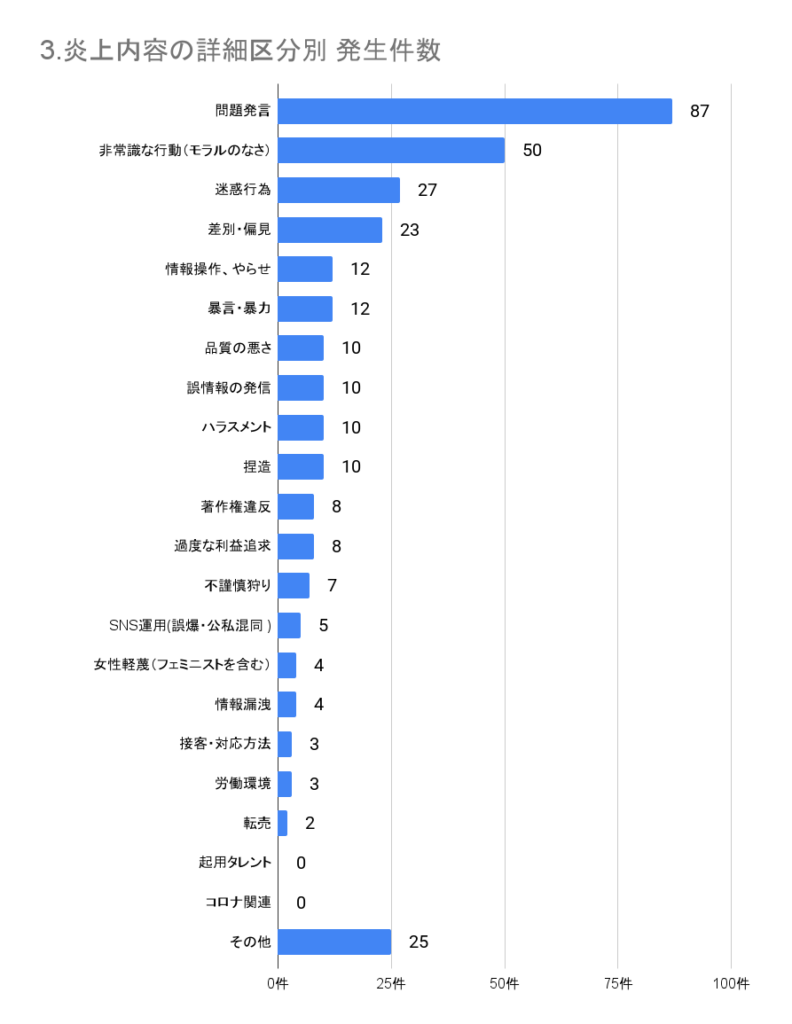 炎上内容の詳細を分析したところ、「問題発言」に関する炎上事案が87件と最も多く、次いで「非常識な行動(モラルのなさ)」に関する炎上事案が50件でした。