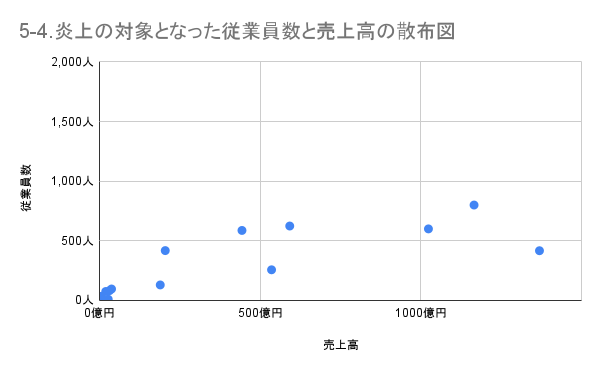 5-4. 炎上の対象となった従業員数と売上高の散布図