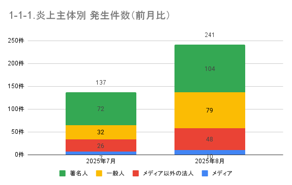 8月の炎上事案は241件でした。前月に比べ、104件増加しています。 炎上主体別の内訳では、「著名人」104件(43.2%)、「一般人」79件(32.8%)、「メディア以外の法人」48件(19.9%)、「メディア」10件(4.1%)という結果でした。