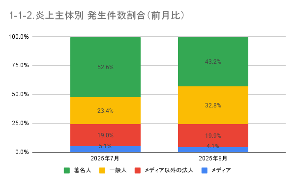 割合については下図のとおり、前月と比較し、「著名人」が9.4ポイントの減少、「一般人」が9.4ポイントの増加、「メディア以外の法人」が0.9ポイントの増加、「メディア」が1ポイントの減少という結果でした。