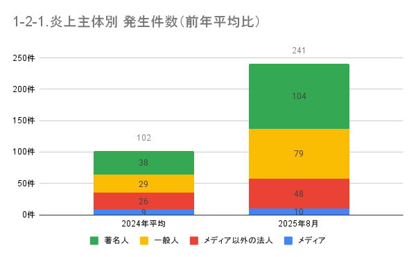 ブロガー 徳力基彦 氏2025年8月の炎上件数は241件と、7月に対して104件もの急増をする結果になったようです。 この件数は3月〜5月の50件台から比べると4倍もの水準になりますし、2023年〜先月までのピークの188件も大幅に上回る件数になります。