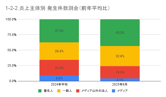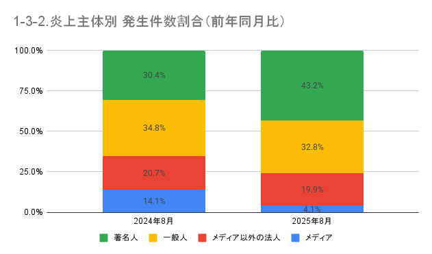 割合については下図のとおり、前年同月と比較し、「著名人」が12.8ポイントの増加、「一般人」が2ポイントの減少、「メディア以外の法人」が0.8ポイントの減少、「メディア」が10ポイントの減少という結果でした。