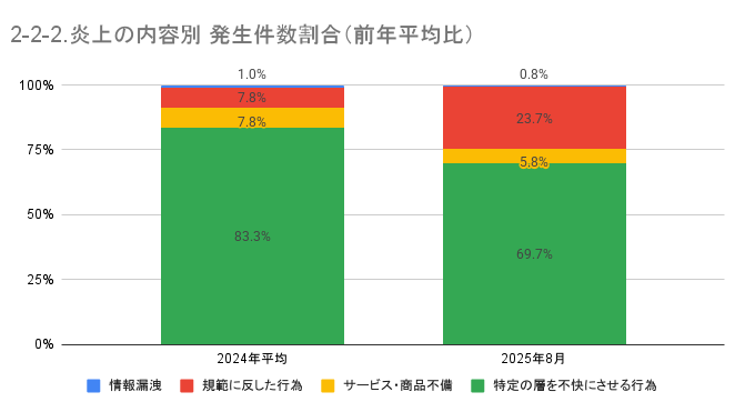前年平均の割合と比較すると、「情報漏洩」が0.2ポイントの減少、「規範に反した行為」が15.9ポイントの増加、「サービス・商品不備」 が2ポイントの減少、「特定の層を不快にさせる行為」が13.6ポイント減少しました。
