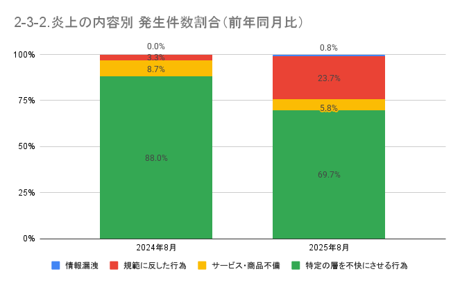 前年同月の割合と比較す「情報漏洩」が0.8ポイント増加、「規範に反した行為」が20.4ポイントの増加 、「サービス・商品不備」が2.9ポイントの減少、「特定の層を不快にさせる行為」が18.3ポイント減少しました。