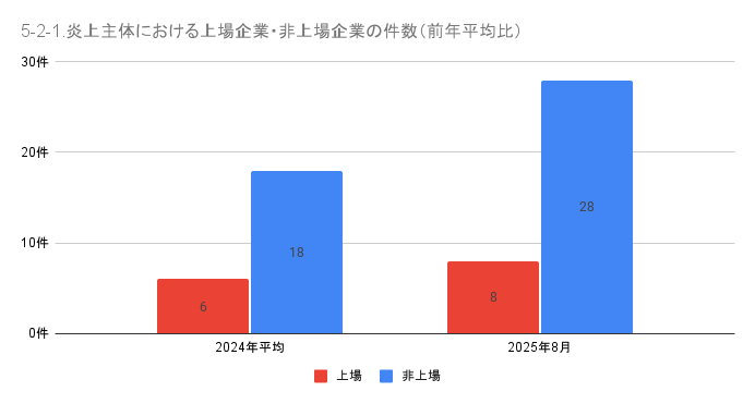 前年同月と比較すると、「上場企業」の件数は7件増加、「非上場企業」の件数は5件増加しました。