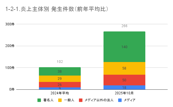 2025年10月の炎上件数は266件と、9月に対して70件増と増加する結果になったようです。 この件数は昨年10月に比べても倍以上の件数となっており、最も炎上が少なかった3月〜5月に比べると5倍近い水準ですから、明らかにこの数ヶ月、昨年に比べて炎上が起こりやすい状況になっていることが分かります。