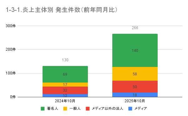 10月の炎上事案は266件でした。前月に比べ、70件増加しています。 炎上主体別の内訳では、「著名人」140件(52.6%)、「一般人」58件(21.8%)、「メディア以外の法人」50件(18.8%)、「メディア」18件(6.8%)という結果でした。