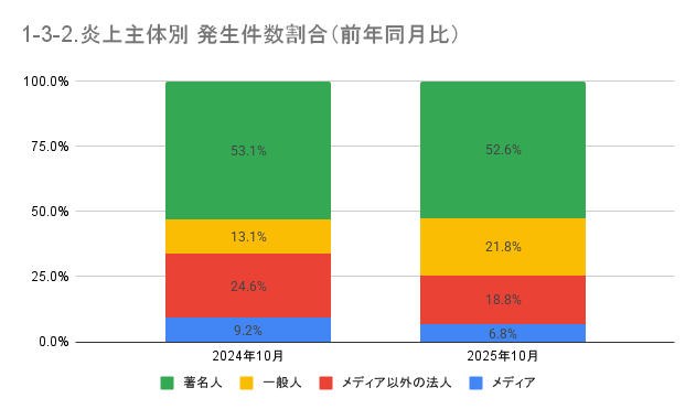 割合については下図のとおり、前年同月と比較し、「著名人」が0.5ポイントの減少、「一般人」が8.7ポイントの増加、「メディア以外の法人」が5.8ポイントの減少、「メディア」が2.4ポイントの減少という結果でした。